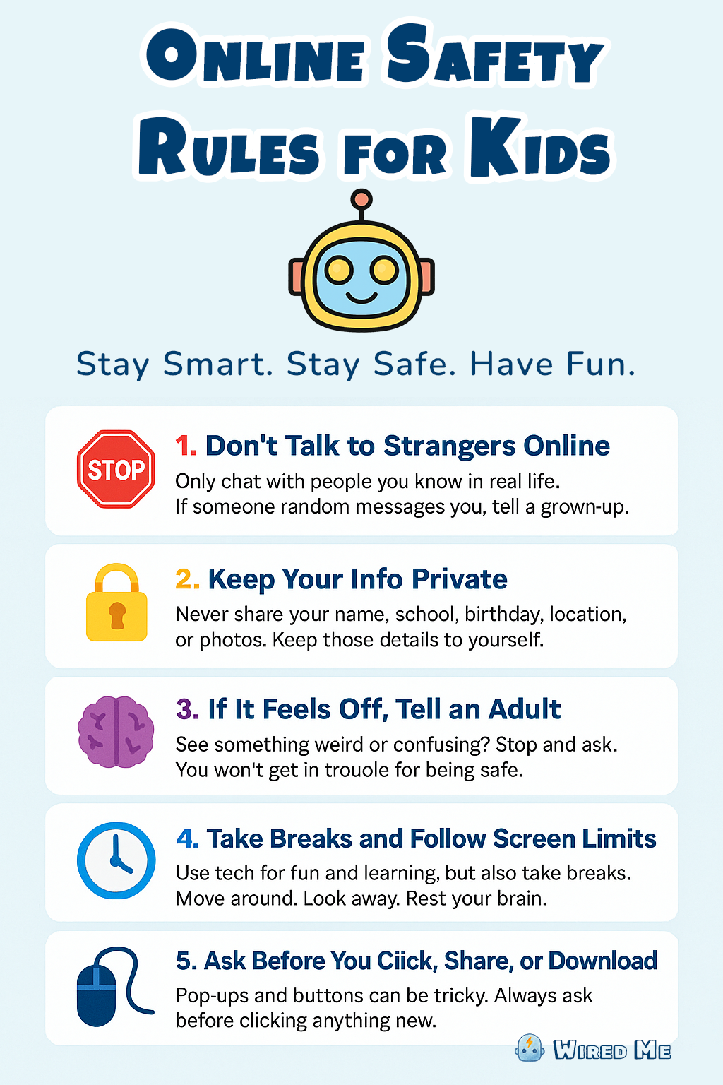 At Wired Me, we believe digital safety is more than just a checklist. It’s about helping kids develop strong habits they can apply anytime they go online. These five rules are simple enough for early learners and strong enough to grow with them over time.